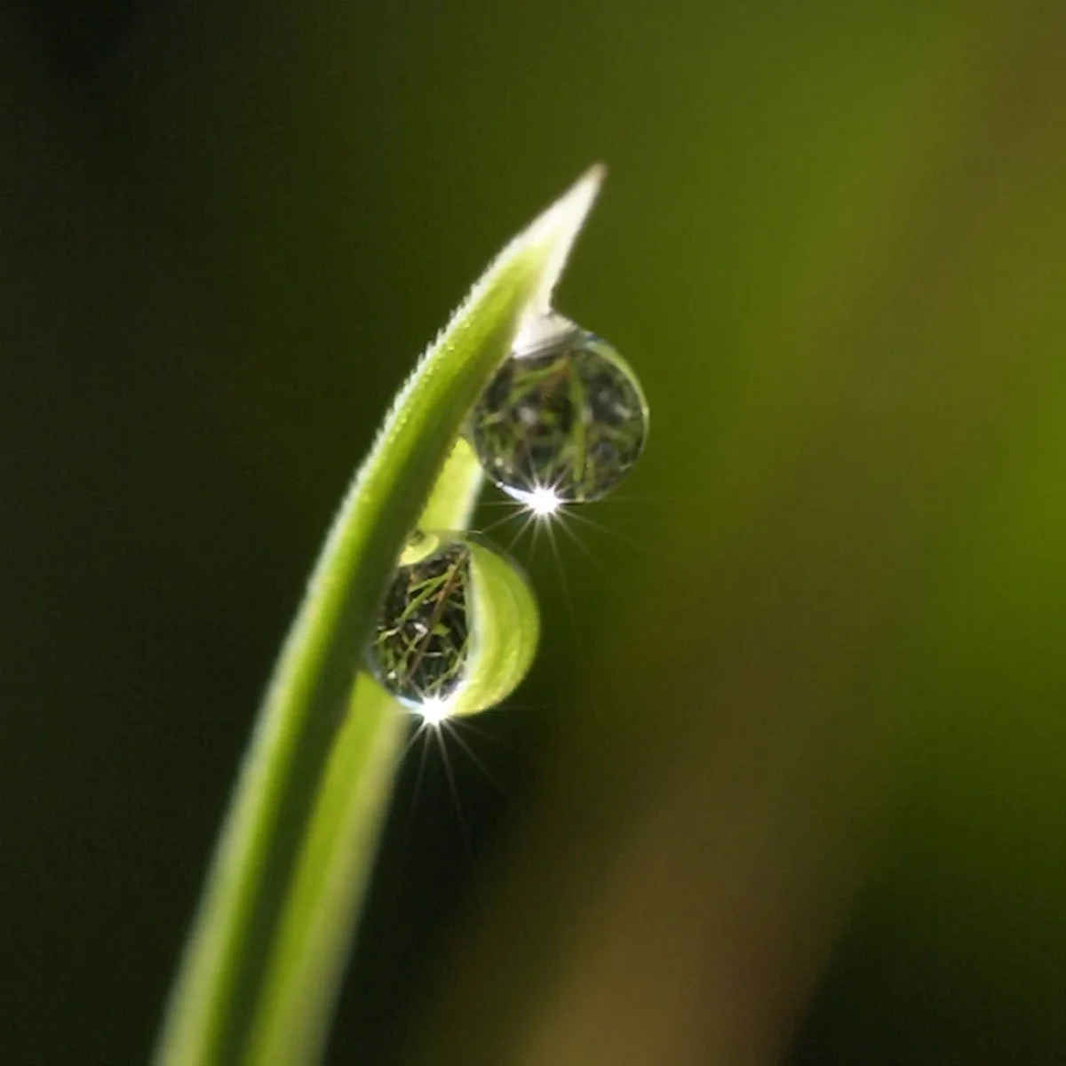 A tiny droplet of water meets a teardrop near the tip of a green leaf.